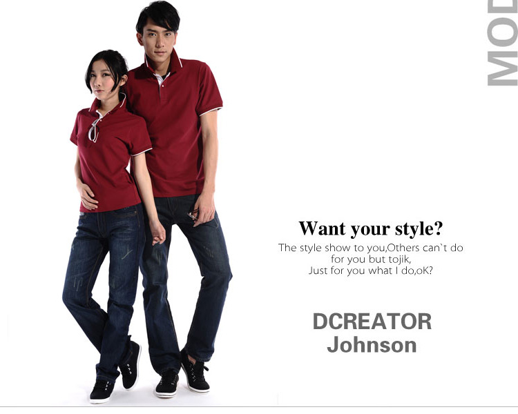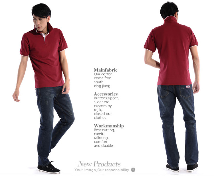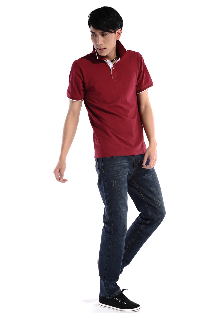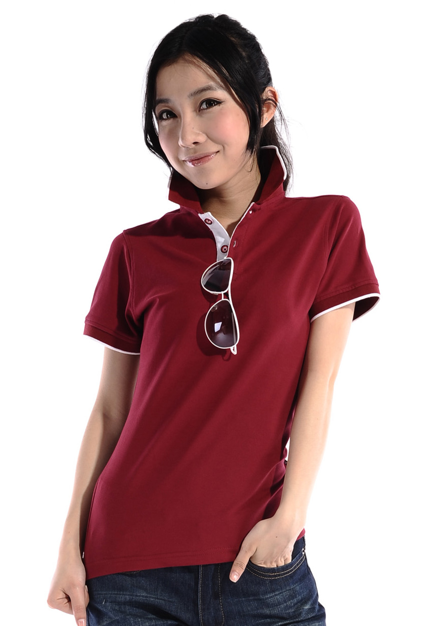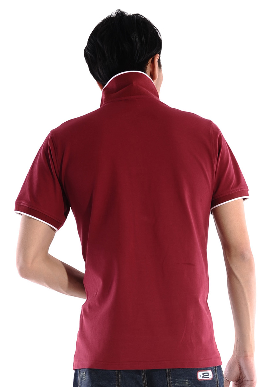 > 棗紅色珠地純棉POLO衫,領袖白色間條撞色,男女時尚款式 1
