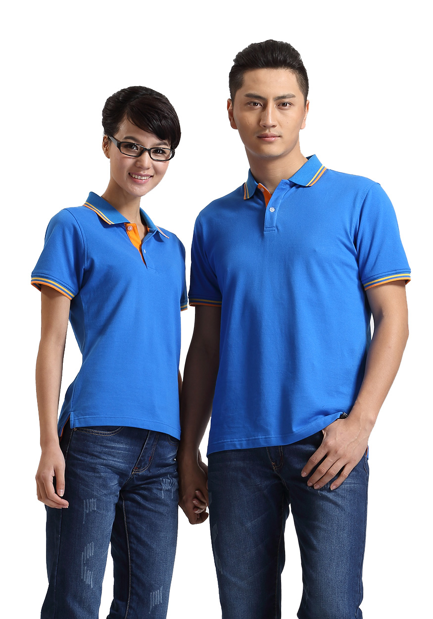 天藍色珠地棉T恤衫,領袖撞白色,男女時尚款定做 1