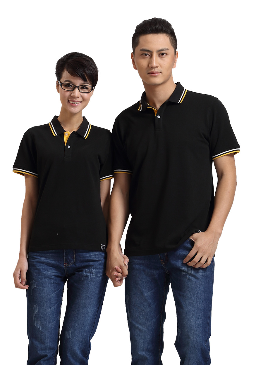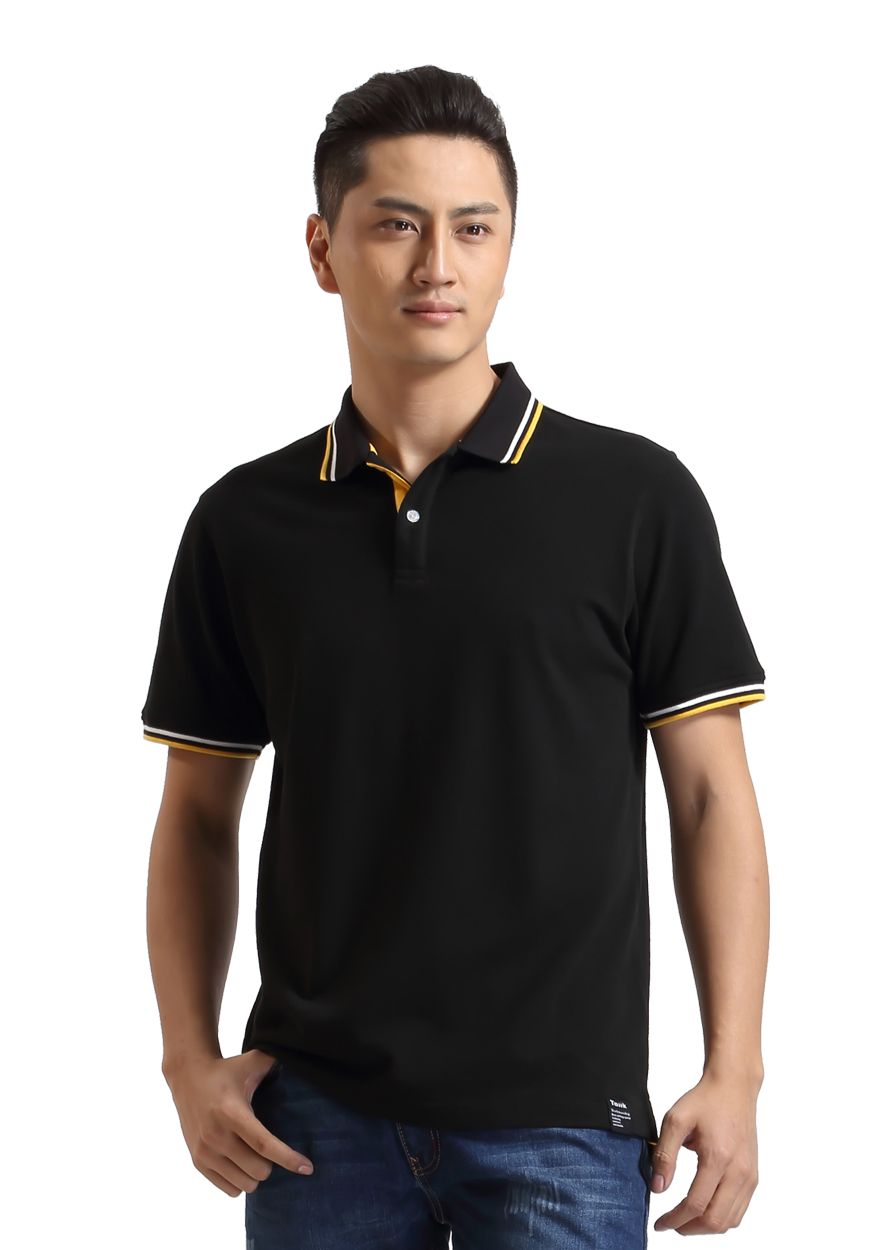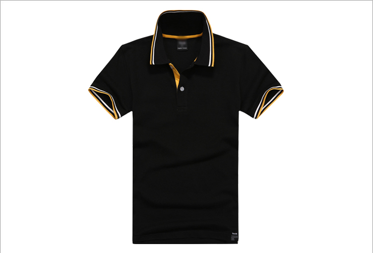 黑色珠地純棉t恤衫,領(lǐng)袖間條撞色,門襟撞色款式制作